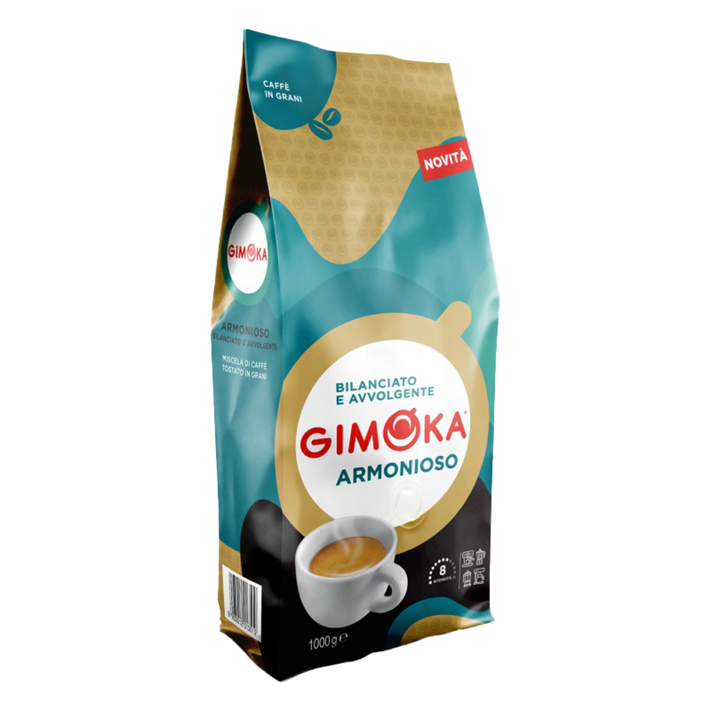 Gimoka Armonioso 1 kg – zrnková zmes 55 % Arabica / 45 % Robusta. Stredné praženie, chuť s tónmi čokolády, karamelu a orechov. Výborná na espresso aj mliečne kávy, bohatá aróma a príjemná textura.