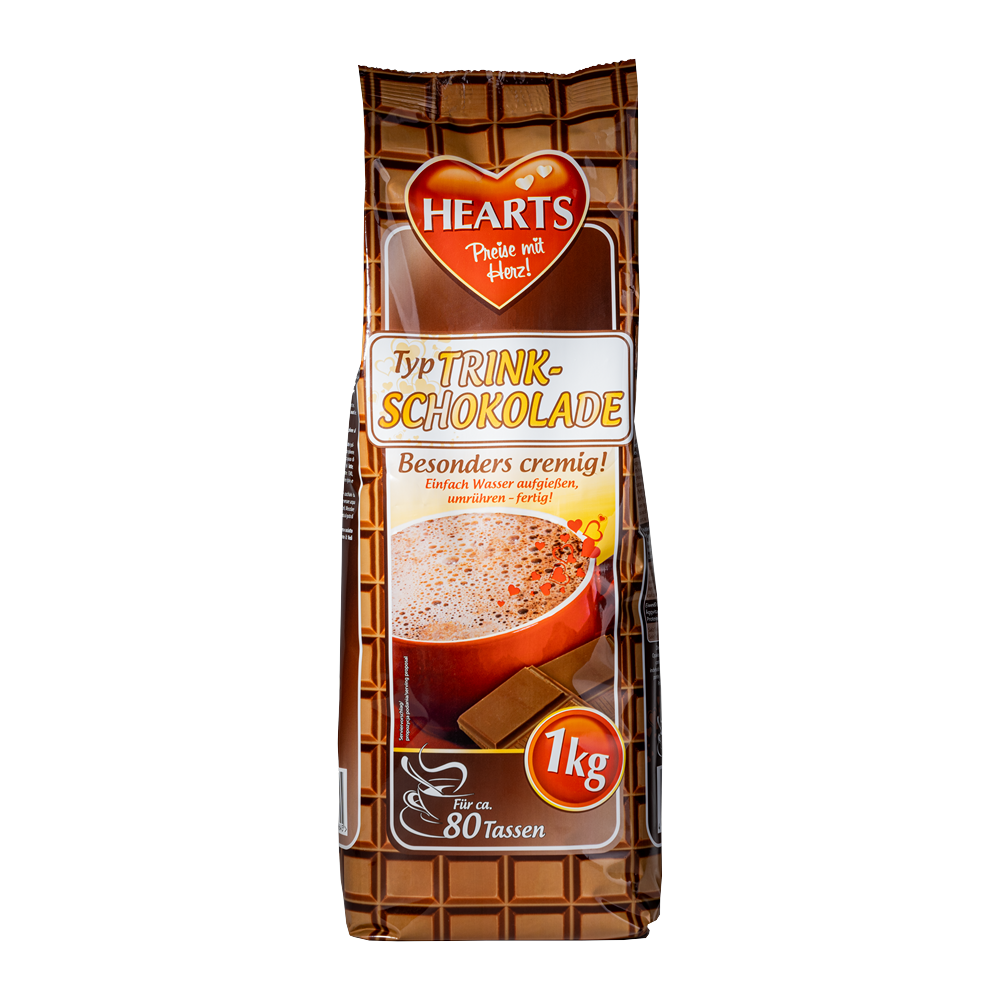 HEARTS Chocolate Drink je lahodné cappuccino s príchuťou horúcej čokolády. Tento doplnok spôsobuje, že nápoj má veľmi výraznú čokoládovú arómu a chuť. Nie je príliš sladké, no je výborne lahodné. Môže byť pripravené na báze mlieka alebo vody. Je zabalený vo výkonnom kilogramovom balení. Z jedného kilogramu je možné vytvoriť až 80 porcií.