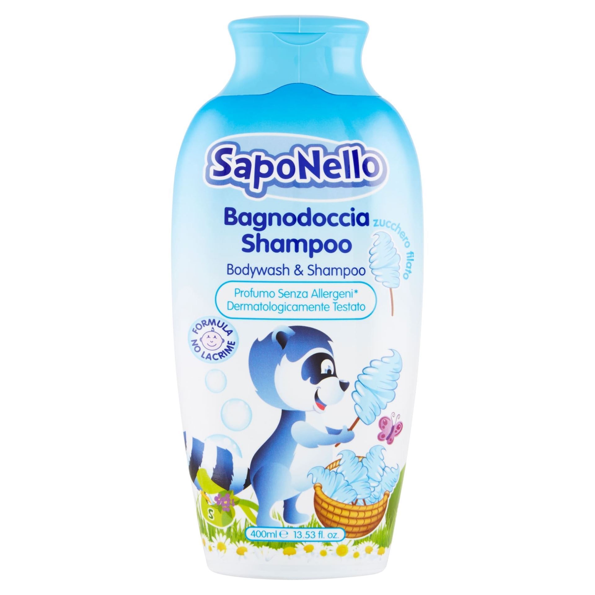SapoNello detský sprchový gél a šampón so sladkou vôňou cukrovej vaty bol špeciálne vyvinutý pre najjemnejšiu detskú pokožku.